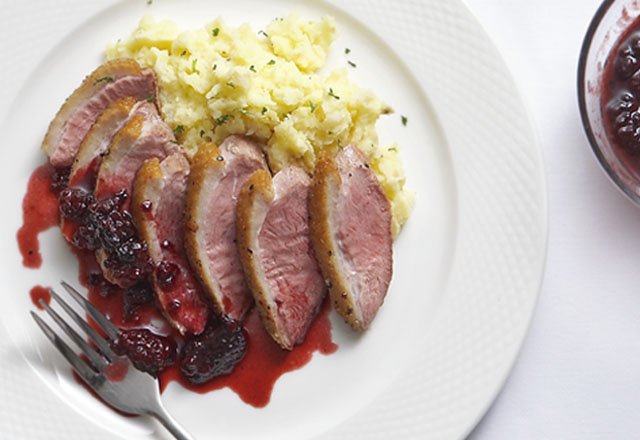 6. หั่นเป็ดเป็นชิ้นหนาๆ เสิร์ฟกับซอสแบล็คเบอร์รีและมันฝรั่งบด
